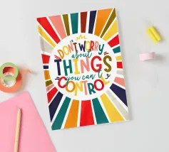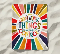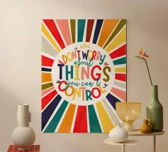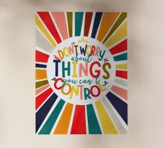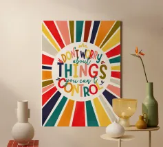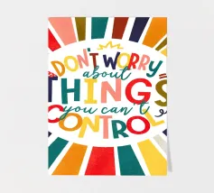 Ritrovate la serenità con questa stampa artistica motivazionale "Don't Worry About Things You Can't Control". I raggi colorati e vivaci e le scritte giocose creano un design allegro ed edificante. Questa stampa serve a ricordare di concentrarsi su ciò che si può controllare e di lasciar perdere il resto. Perfetta per aggiungere un tocco di positività e ispirazione a qualsiasi spazio. Da showmemars