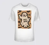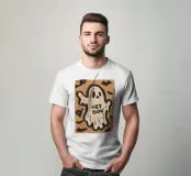 Un giocoso fantasma di Halloween circondato da pipistrelli.