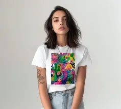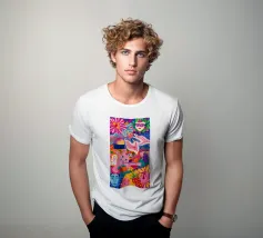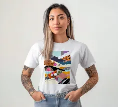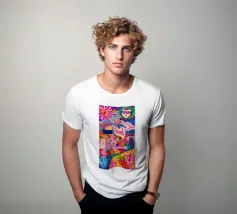 La follia colorata e il caos del collage. Ogni cosa casuale in un'immagine, con un tocco di grafica retrò. Dinosauri, alieni, polpi, funghi, pesci palla, uova fritte, montagne, lampioni, luna, biglietti del cinema, ecc.