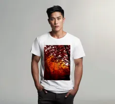 La luce dorata del sole filtra attraverso le vibranti foglie autunnali, creando un'atmosfera calda e serena in un ambiente naturale. I ricchi colori delle foglie esaltano la bellezza della scena.
