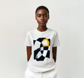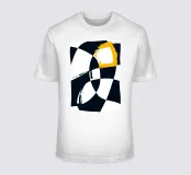 Audaci motivi geometrici si intrecciano con un sorprendente accento giallo in un design che enfatizza il contrasto. Le forme curve e angolari in bianco e nero creano un flusso visivo dinamico.