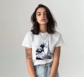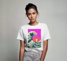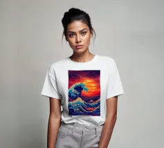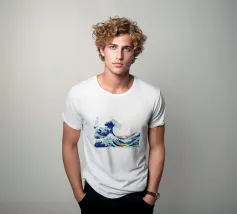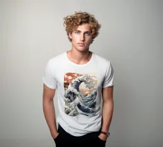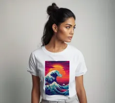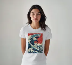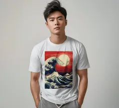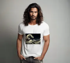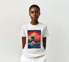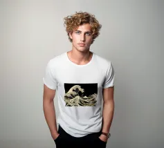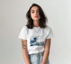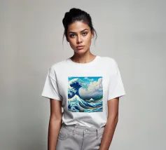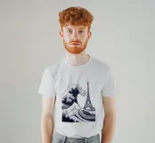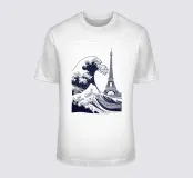 L'immagine raffigura un'illustrazione stilizzata in bianco e nero della Grande Onda al largo di Kanagawa, una famosa xilografia giapponese, con la Torre Eiffel sovrapposta all'onda. L'onda è raffigurata in un movimento dinamico e vorticoso, con creste spumeggianti e una base blu intenso. La Torre Eiffel si erge alta e slanciata, con la sua struttura intricata che contrasta con la forma organica dell'onda.