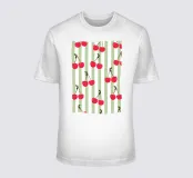 Un divertente e rinfrescante disegno a righe verdi con simpatiche ciliegie disegnate a mano. Perfetto per cucine, decorazioni estive o stampe di moda.