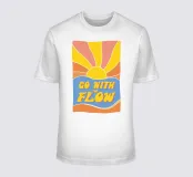 Un motivo solare in stile anni '70: un sole giallo splende in alto con raggi caldi in rosa, arancione e giallo, mentre sotto scorrono onde blu, con la scritta "GO WITH THE FLOW" in un vibrante giallo vintage. Le linee curve e la ricca palette di colori trasmettono leggerezza e una sensazione di spensieratezza estiva. Ottimismo, libertà e relax: un mantra visivo che invita a godersi il momento e ad abbandonarsi al ritmo naturale.