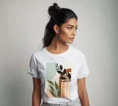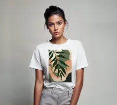 Un ramo di foglie si sovrappone a forme geometriche, tra cui linee arcuate e toni sfumati e stratificati. La combinazione crea un connubio armonioso tra natura e design astratto.