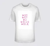 Un'opera tipografica moderna e giocosa con saluti in diverse lingue: HEJ, HEY, HI, HELLO e HOLA.