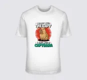 Un simpatico capibara si trova al centro di un disegno con il testo umoristico: "Non ho bisogno di terapia, ho solo bisogno di un capibara".