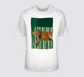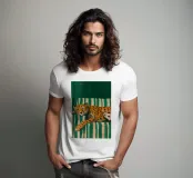 Un'opera d'arte serena e stravagante di un ghepardo che sonnecchia pacificamente su un divano vintage a righe bianche e verdi. I motivi vivaci e la postura accogliente del grosso felino creano un contrasto sognante e spiritoso tra la natura selvaggia e la rilassata vita domestica. Perfetto per gli amanti degli animali, i collezionisti d'arte eclettica e gli appassionati di estetica d'interni giocosa.