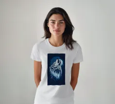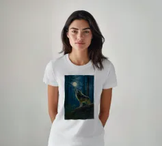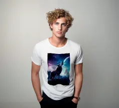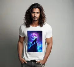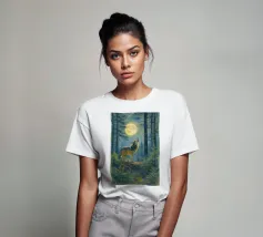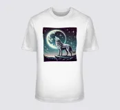 Una splendida illustrazione in stile cartoon di un maestoso lupo argentato che ulula alla luna crescente sotto un cielo stellato. Il lupo, con la sua pelliccia scintillante, si erge fiero su una sporgenza rocciosa, illuminata dalla luce della luna. La scena è ambientata in un cielo blu e nero profondo, pieno di stelle scintillanti, che evoca un senso di magia e serenità. La luna crescente brilla dolcemente, completando la presenza eterea del lupo. Alberi ombrosi e colline lontane completano l'atmosfera tranquilla e mistica.