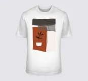 Il design minimalista è caratterizzato da una semplice pianta in vaso con foglie scure, contrapposta a forme astratte e sovrapposte nei toni terrosi del rosso, del grigio e del bianco. Le linee pulite e i blocchi di colore decisi creano un'estetica moderna e rilassante.