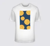 Un motivo grafico in stile pop art di fette d'arancia su uno sfondo blu scuro. La composizione è moderna, vibrante e rappresenta un design fresco, vivace ed elegante.