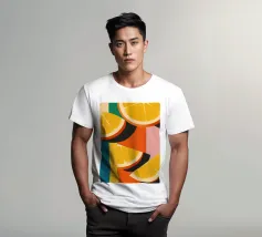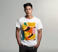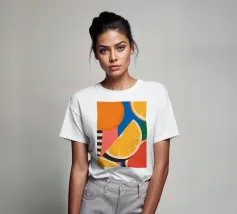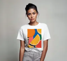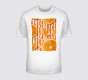 Un vivace motivo grafico di fette d'arancia ripetute su uno sfondo a strisce bianche e arancioni. La composizione è fresca, saporita, moderna e un'allegra celebrazione degli agrumi.
