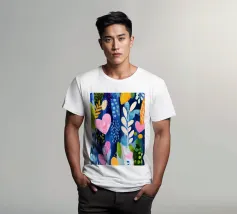 Un patchwork allegro e commovente di piante stilizzate, motivi vivaci e un grande cuore affettuoso. Questa opera d'arte eclettica è una gioiosa celebrazione dell'amore, della crescita e della bellezza artigianale.