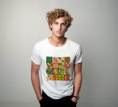 Una composizione astratta audace ed energica, caratterizzata da una griglia di motivi geometrici colorati. Il vibrante mix di forme, dai soli alle scacchiere, crea una festa visiva gioiosa e dinamica.