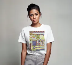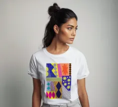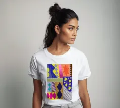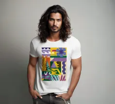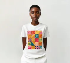 Un motivo astratto combina blocchi di colore simili a patchwork con energici scarabocchi e strisce, creando un design dinamico, giocoso e artistico.