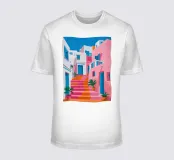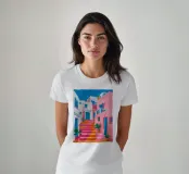 Quest'opera d'arte cattura la bellezza iconica di un'isola greca con i suoi gradini vivaci e colorati nei toni del rosa, dell'arancione e del rosso. La classica architettura bianca e blu incornicia la scena, creando un'immagine gioiosa e pittoresca che trasporta immediatamente in un vicolo soleggiato di Santorini.