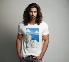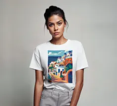 Una pittoresca illustrazione degli iconici edifici bianchi e delle cupole blu di un'isola greca, probabilmente Santorini, affacciata sul mare. La scena è una perfetta rappresentazione, inondata di sole, di un paradiso mediterraneo.