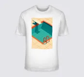 Poster raffigurante una piscina estiva con una scala arancione e riflessi d'acqua stilizzati. Un gioco di ombre, luci grafiche e una tavolozza solare. Perfetto per un look vintage e rinfrescante.