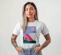Una scena d'interni stravagante e astratta con una scala rosa, piante in vaso e un sole e una luna nel cielo visti attraverso un arco. L'opera d'arte è un paesaggio da sogno giocoso e bohémien.