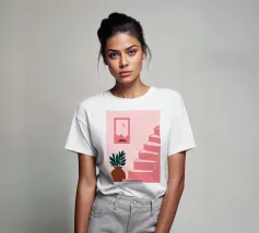 Un gatto bianco siede pacificamente sul pianerottolo di una scala esterna di un edificio dalle pareti rosa. La scena, con le sue linee pulite e gli archi, è un'istantanea architettonica serena, minimalista e affascinante.