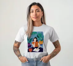 Illustrazione di una donna con capelli rossi e occhiali seduta a un tavolo con un libro aperto, un altro libro e una tazza. La camicia arancione a scacchi e lo sfondo blu creano una scena colorata e accogliente di lettura o studio.