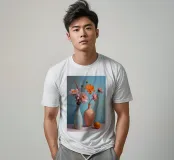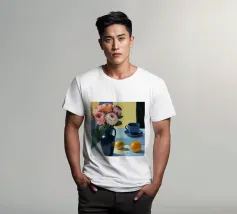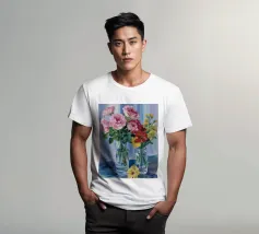 Elegante poster di natura morta con vasi in ceramica dai toni pastello riempiti di fiori sbocciati rosa e arancioni, su un morbido sfondo blu. Perfetto per aggiungere un tocco artistico e sereno agli interni moderni. Ideale per gli amanti dell'arte e dell'arredamento in cerca di ispirazione floreale.