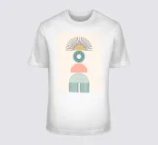 Una composizione geometrica presenta varie forme, tra cui un semicerchio che ricorda il sole, cerchi concentrici e archi in tenui tonalità pastello. Il disegno è simmetrico e bilancia gli elementi visivamente attraenti.