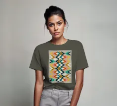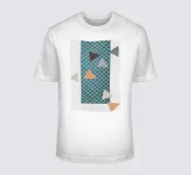 Le forme geometriche sono disposte su uno sfondo strutturato, caratterizzato da un motivo a griglia verde acqua. I triangoli di varie tonalità creano un contrasto visivo dinamico.