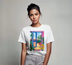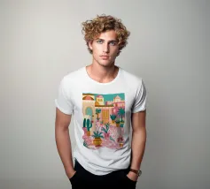 Questo disegno porta in casa vostra la gioia di vivere mediterranea e la leggerezza estiva. L'illustrazione colorata mostra un vivace patio pieno di piante fiorite e cactus in vasi eleganti, circondati da colori caldi e terrosi. L'aspetto moderno e disegnato a mano e l'armoniosa composizione cromatica di rosa, giallo, blu e verde rendono il motivo un richiamo visivo ideale per murales, tazze, cuscini e molto altro. Perfetto per gli amanti delle piante che desiderano portare la natura e il colore nei loro spazi abitativi. Un'attrazione per ogni casa o un regalo creativo.