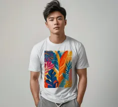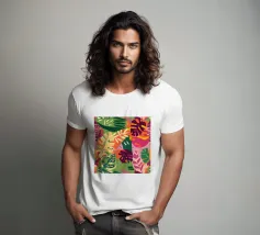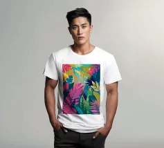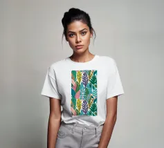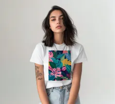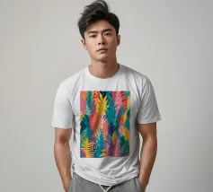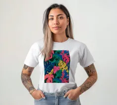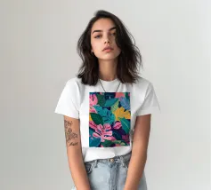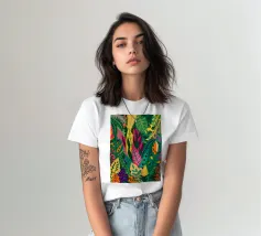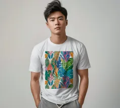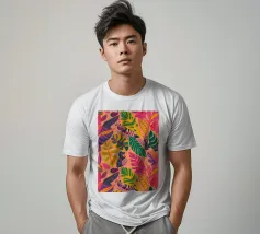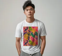 Un motivo denso e colorato di foglie tropicali sovrapposte e forme astratte in tonalità vivaci di giallo, rosa, blu e verde, che creano un design gioioso ed energico.