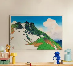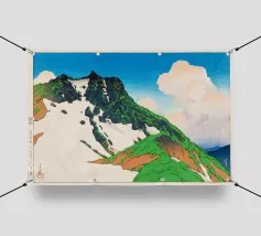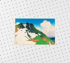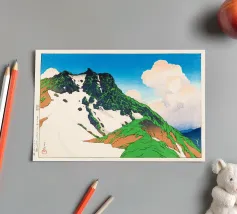 Travel Souvenir Third Series View of Asahigadake from Mount Haku di Kawase Hasui presenta un'ampia veduta di montagna con aria frizzante, cime stratificate e una morbida luce atmosferica. Le delicate transizioni di colore e la composizione raffinata di Hasui catturano la maestosità del paesaggio alpino giapponese, creando un'atmosfera serena e contemplativa. Ideale per gli amanti delle stampe giapponesi su blocchi di legno, delle scene di montagna shin-hanga e della tranquilla arte naturalistica, questo pezzo conferisce profondità, eleganza e bellezza senza tempo a qualsiasi interno.