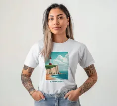 Design di viaggio minimalista dell'Inghilterra meridionale con le famose scogliere bianche (chalk cliffs) e il faro sulla costa inglese vicino a Dover. Tipico paesaggio di scogliere chiare.