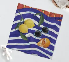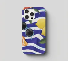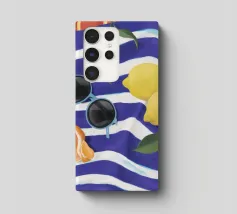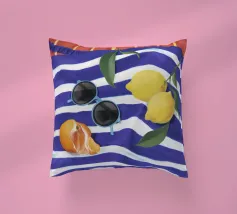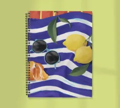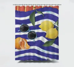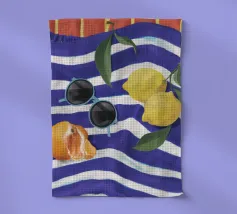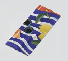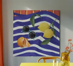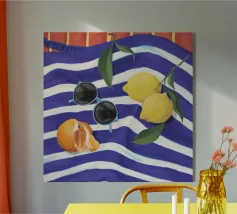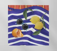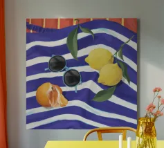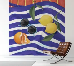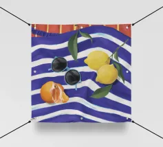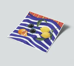 Una composizione di still life con limoni maturi, olive nere e un mandarino sbucciato appoggiati su una tovaglia a righe bianche e blu, che evoca una classica atmosfera mediterranea.