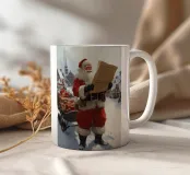 Babbo Natale si trova nel villaggio invernale innevato, assorto in una lunga lista di desideri. Dietro di lui c'è una slitta piena di regali colorati, pronta per la grande notte di Natale. La scena pittoresca irradia attesa, magia e calore: un simbolo affettuoso delle festività e dello spirito di donazione.