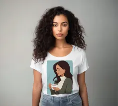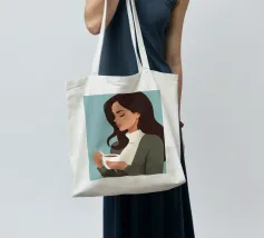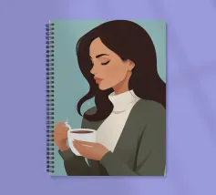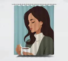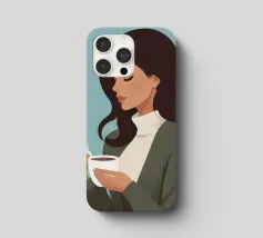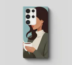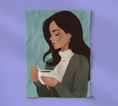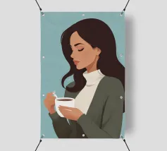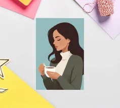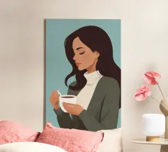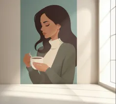 Una donna che tiene in mano una tazza di caffè caldo nella morbida luce del mattino. I toni delicati e le linee semplici ne fanno un'opera perfetta per le mattine lente e le routine tranquille.