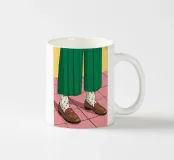 Una vista ravvicinata e dall'angolo basso delle gambe di una persona, che mostra calzini eleganti a pois, pantaloni verdi e scarpe marroni. L'illustrazione è un'ode eccentrica e alla moda ai dettagli dello stile personale.