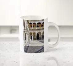 L'immagine mostra un interno storico della Casa de Pilatos di Siviglia, un palazzo del XVI secolo con influenze architettoniche mudéjar, gotiche e rinascimentali. Le pareti sono completamente ricoperte da piastrelle decorate con motivi geometrici e floreali nei toni del blu, del verde e del marrone. Queste piastrelle sono tipiche dell'arte mudéjar e riflettono la diversità culturale dell'Andalusia. Il soffitto è costituito da pannelli in legno dorato con complessi ornamenti e rilievi che documentano la maestria dell'epoca.