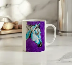 Testa di cavallo in inchiostro nero con vernice dorata e pastelli a olio per lo sfondo color malva.