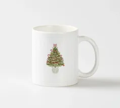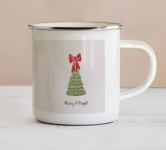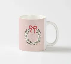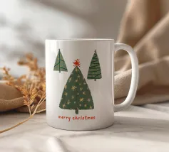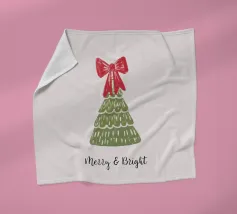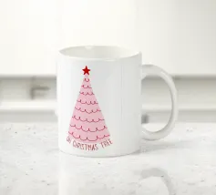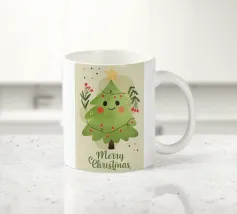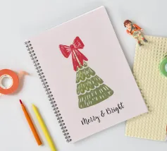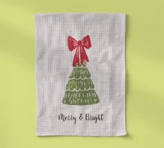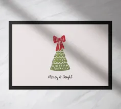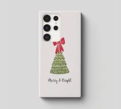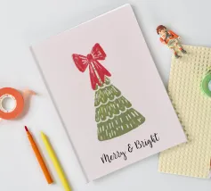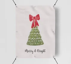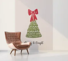 Disegno di un pino verde con neve e un fiocco rosso con citazione di Natale