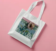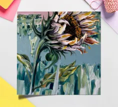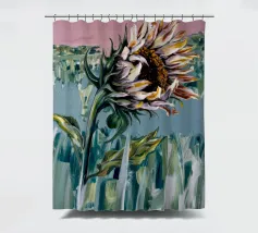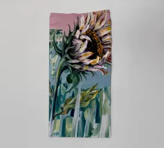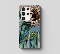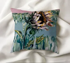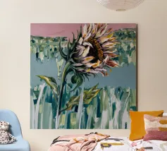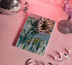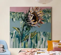 Un girasole si piega nella luce rosa sbiadita, i suoi petali si arricciano con il tempo, riecheggiando la grazia nel declino.
