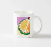 Illustrazione che mostra un frutto di durian spaccato, con un cielo blu e nuvole sullo sfondo.