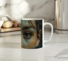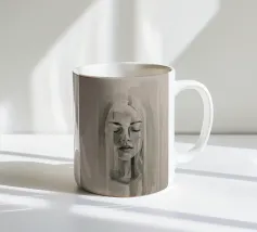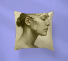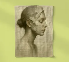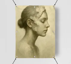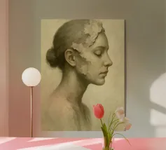 Un'opera d'arte moderna ed espressiva che mostra una figura femminile di profilo, metà umana e metà pietra. Le sottili transizioni tra pelle e struttura simboleggiano profondità emotiva, fragilità e forza allo stesso tempo. La combinazione di colori neutri, beige e grigi, conferisce all'immagine calma ed eleganza, perfetta per ambienti moderni, minimalisti e profondi.