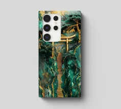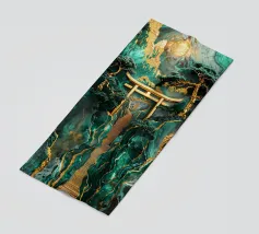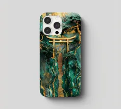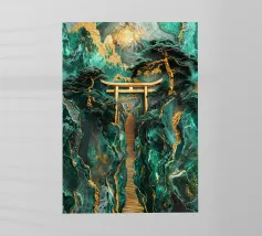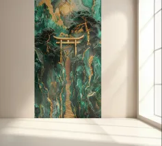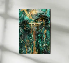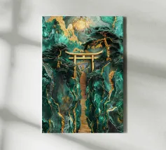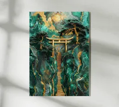 Paesaggio artigianale Kintsugi con un percorso sereno attraverso un cancello Torii dorato, incorniciato da montagne di giada e alberi secolari sotto la luna luminosa.