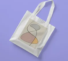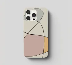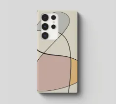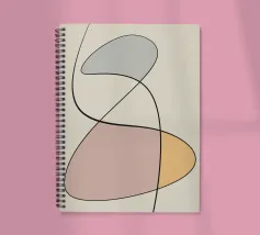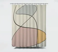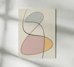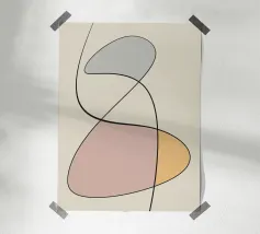 Forme geometriche astratte in colori pastello si intrecciano con sottili linee nere. La composizione crea un senso di equilibrio grazie alle sue forme curve e alle tonalità tenui.