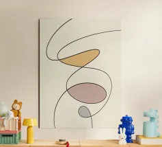 Linee semplici si curvano e si intersecano per creare un disegno astratto dall'estetica minimalista. Le forme piene dei toni della terra sono sovrapposte a linee nere su uno sfondo color crema, evocando un senso di moderna semplicità.
