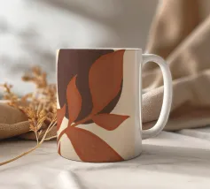 Il design minimalista è caratterizzato da una semplice pianta in vaso con foglie scure, contrapposta a forme astratte e sovrapposte nei toni terrosi del rosso, del grigio e del bianco. Le linee pulite e i blocchi di colore decisi creano un'estetica moderna e rilassante.