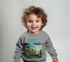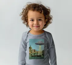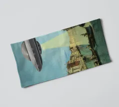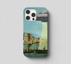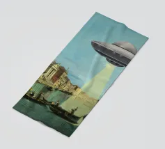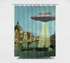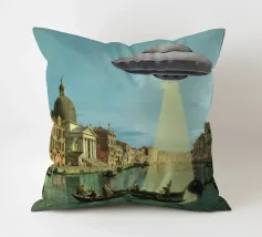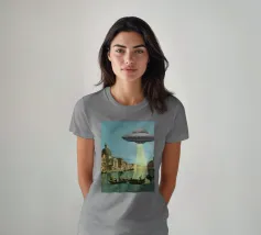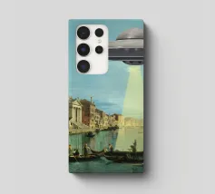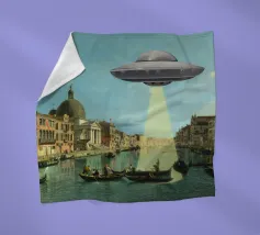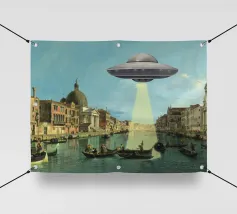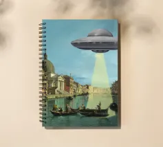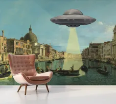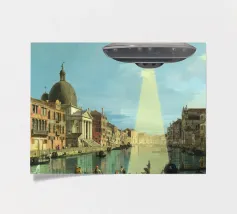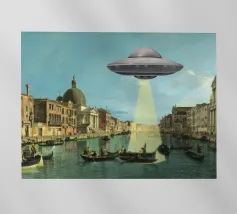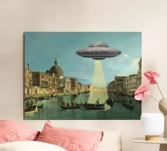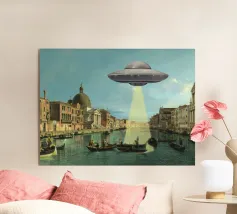 Alieni nelle loro astronavi UFO che vengono a rapire alcune gondole nei canali di un dipinto vintage di Venezia, Italia. Surreale, divertente, fantascientifico, retrofuturo, collage digitale di MsGonzalez