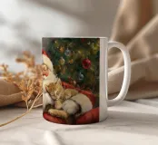 Un'immagine natalizia che scalda il cuore e che infonde sicurezza: Babbo Natale siede rilassato davanti all'albero decorato a festa e tiene in braccio un gattino che dorme pacificamente. I colori tenui e la luce calda conferiscono alla scena una calma magica, simbolo dell'amore, della pace e della tranquilla gioia del periodo natalizio.