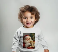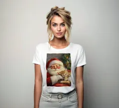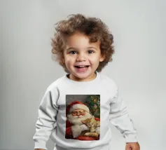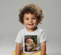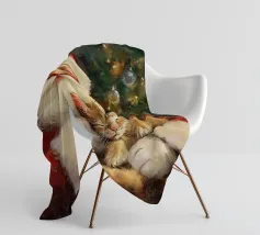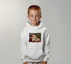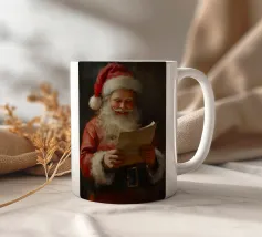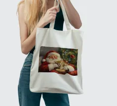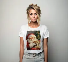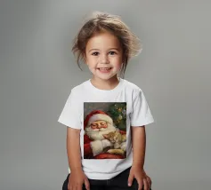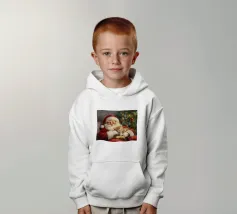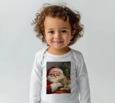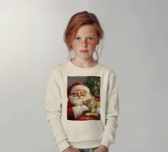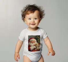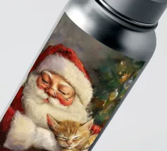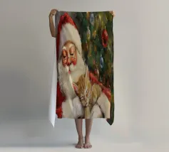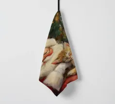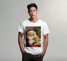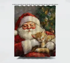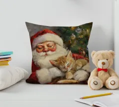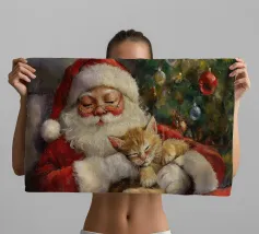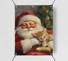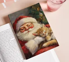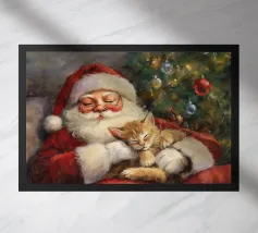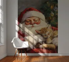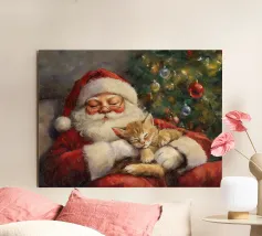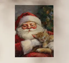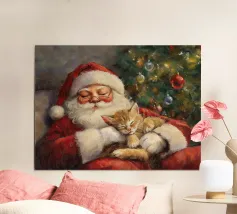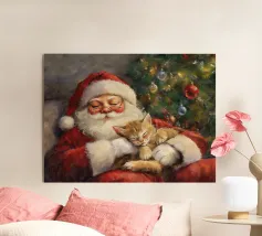Un'immagine natalizia che scalda il cuore e che infonde sicurezza: Babbo Natale siede rilassato davanti all'albero decorato a festa e tiene in braccio un gattino che dorme pacificamente. I colori tenui e la luce calda conferiscono alla scena una calma magica, simbolo dell'amore, della pace e della tranquilla gioia del periodo natalizio.