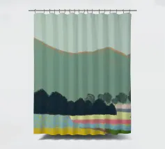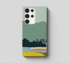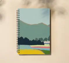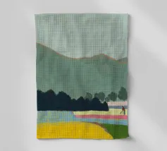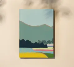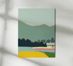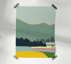 Un paesaggio tranquillo è caratterizzato da una serie di campi colorati con una figura solitaria che cammina lungo un sentiero. Sullo sfondo, morbide colline verdi e una fila di alberi creano un'atmosfera serena.
